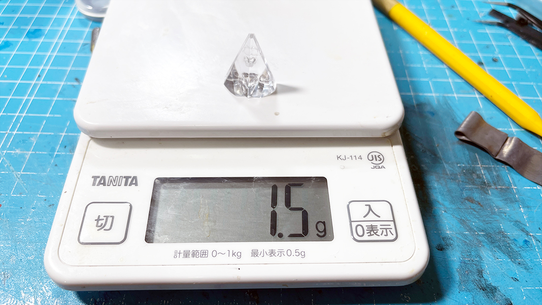 さっきのクリアパーツの三分の一くらいの体積しかないですが4.5グラムあります。プラに対して9倍くらい重いということになりますね。