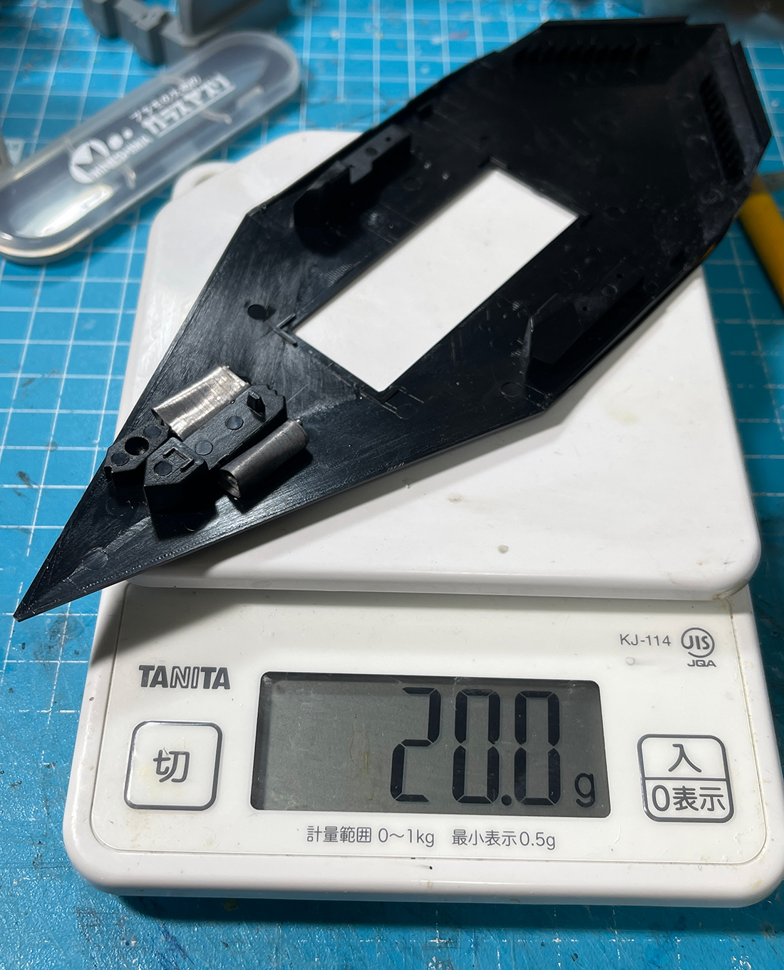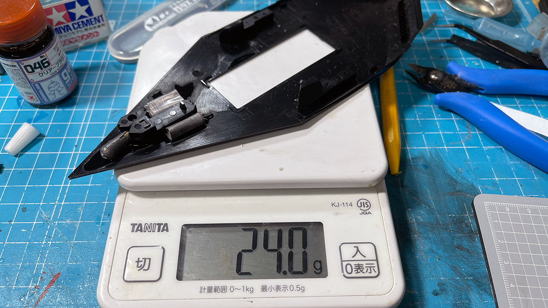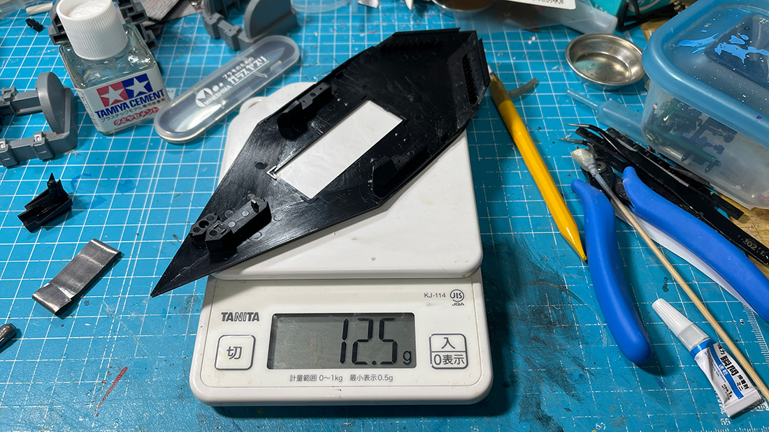 組立説明書には5グラム足してとあり、キット付属のオモリパーツは1.5グラムですから6.5グラムというメーカー指定の重量より1グラム多めにオモリを入れたことになります。