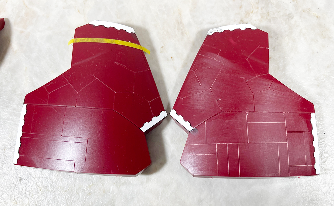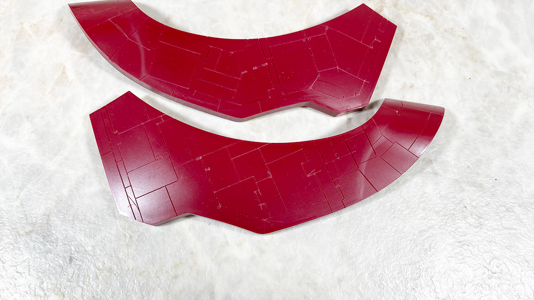 シルエットはもう最高に美しいのですが、面については基本的にかなり大味なキットなのでこういうパーツが連続すると完成後悪目立ちしそうだな、と思いまして頑張ってすじ彫り入れまくってるんですけど