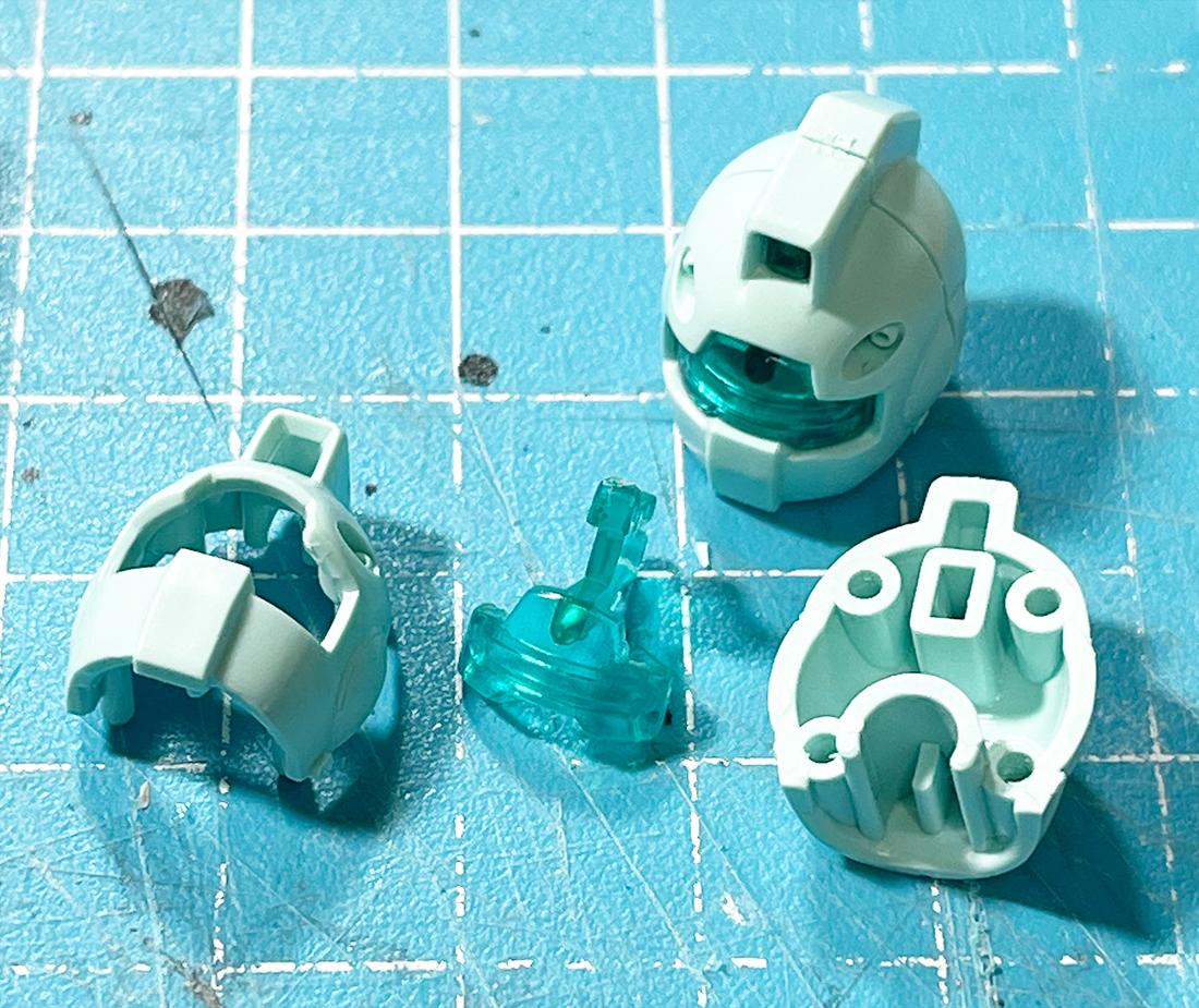 良いキットなんですけど頭部がね、前後モナカでクリアーパーツを挟み込む構造でそのまま作るとマスキングとか耳の処理とかかなり難しいんですよね。ということで後ハメ加工まずやっていきます。