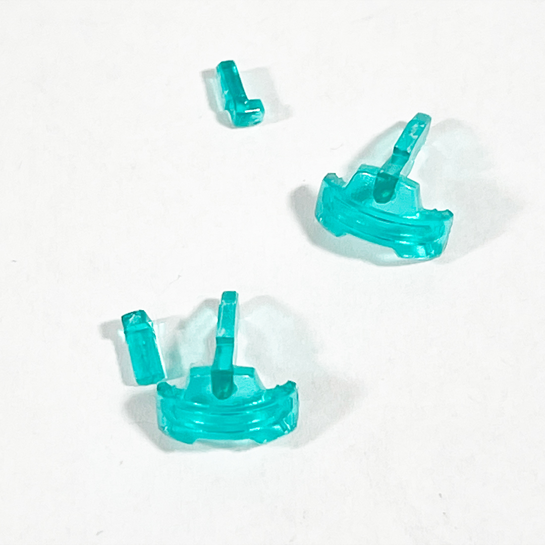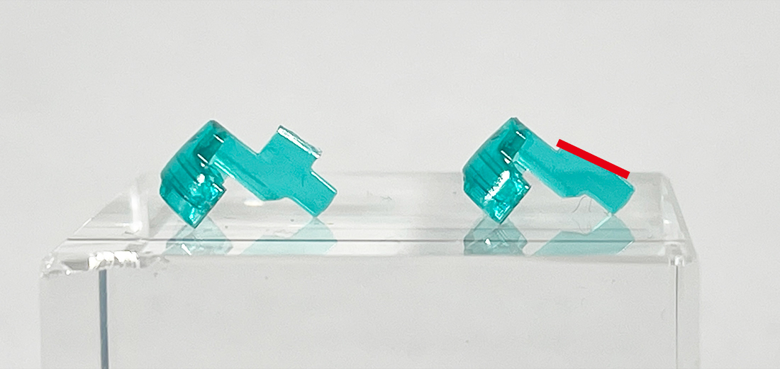 でお次はバイザーなんですが私はそのままでは上手く後から頭部に嵌め込むことができないので写真右側のように斜めにテーパーをつけるイメージでカットします。たったこれだけの手数で塗装後の嵌め込みやすさが格段に向上します。