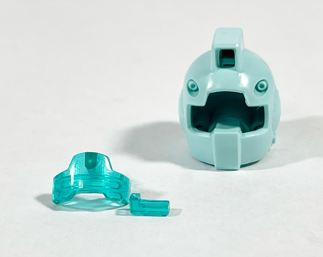 よくできてますよね。ひとつの部品で額とバイザーの表現を両立しています。ただね、塗装するとき一気に難易度あがっちゃうんですよね。まぁマスキングしても良いっちゃ良いのですが額を綺麗に処理するのは至難の技でしょうね。