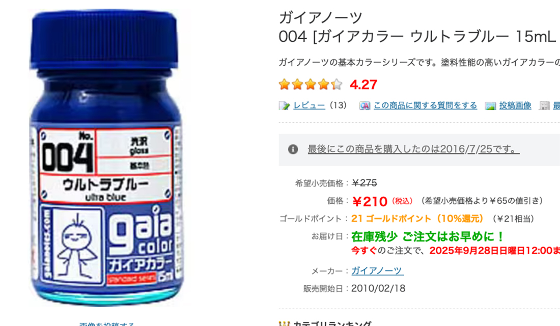 ガイアノーツのウルトラブルーを使います。残りわずかになっており今後のために追加で一本ヨドバシに発注しました。