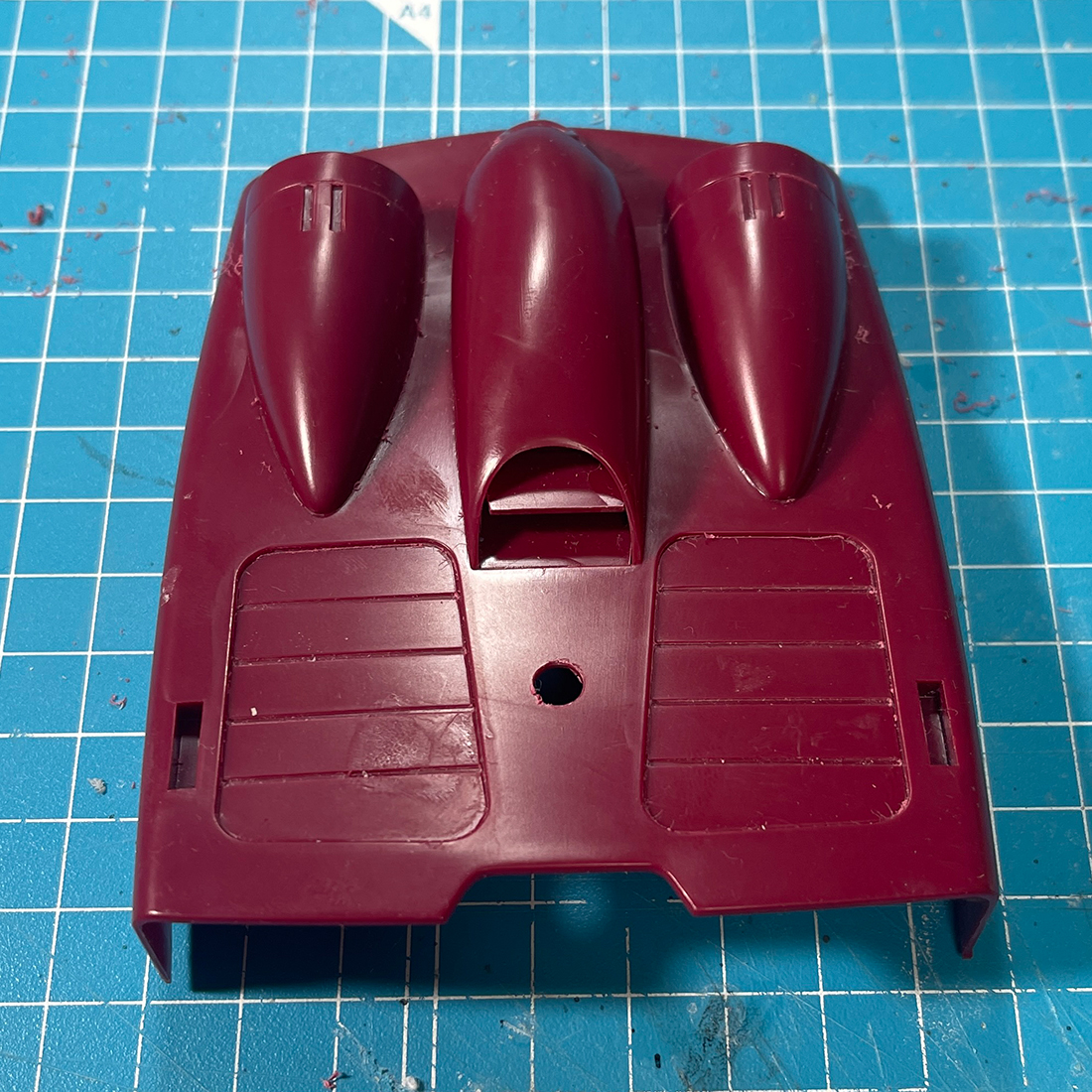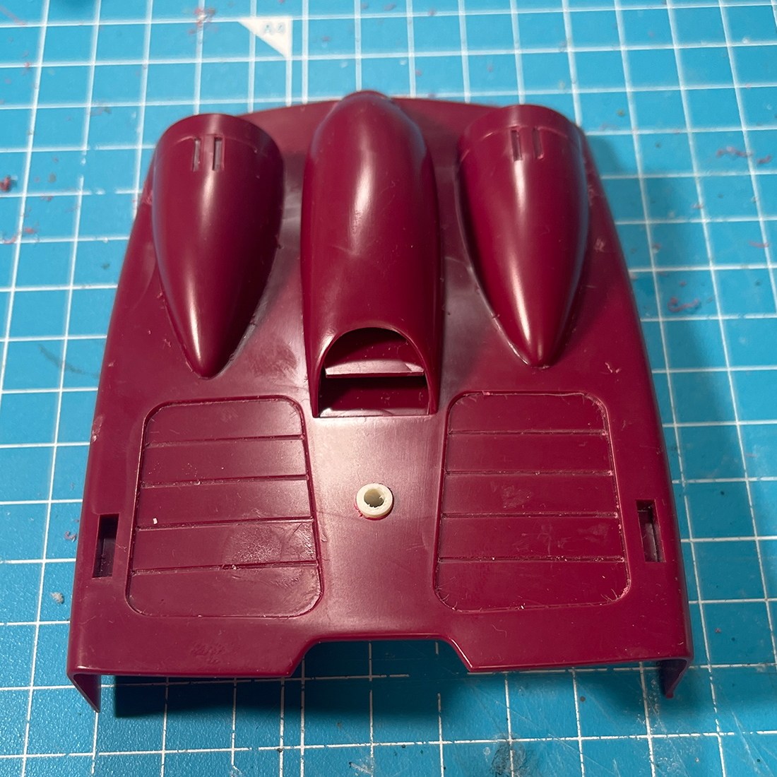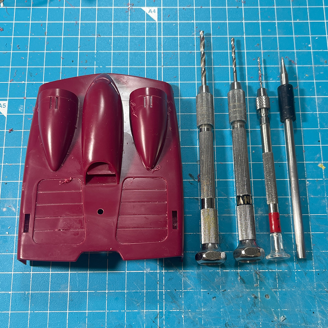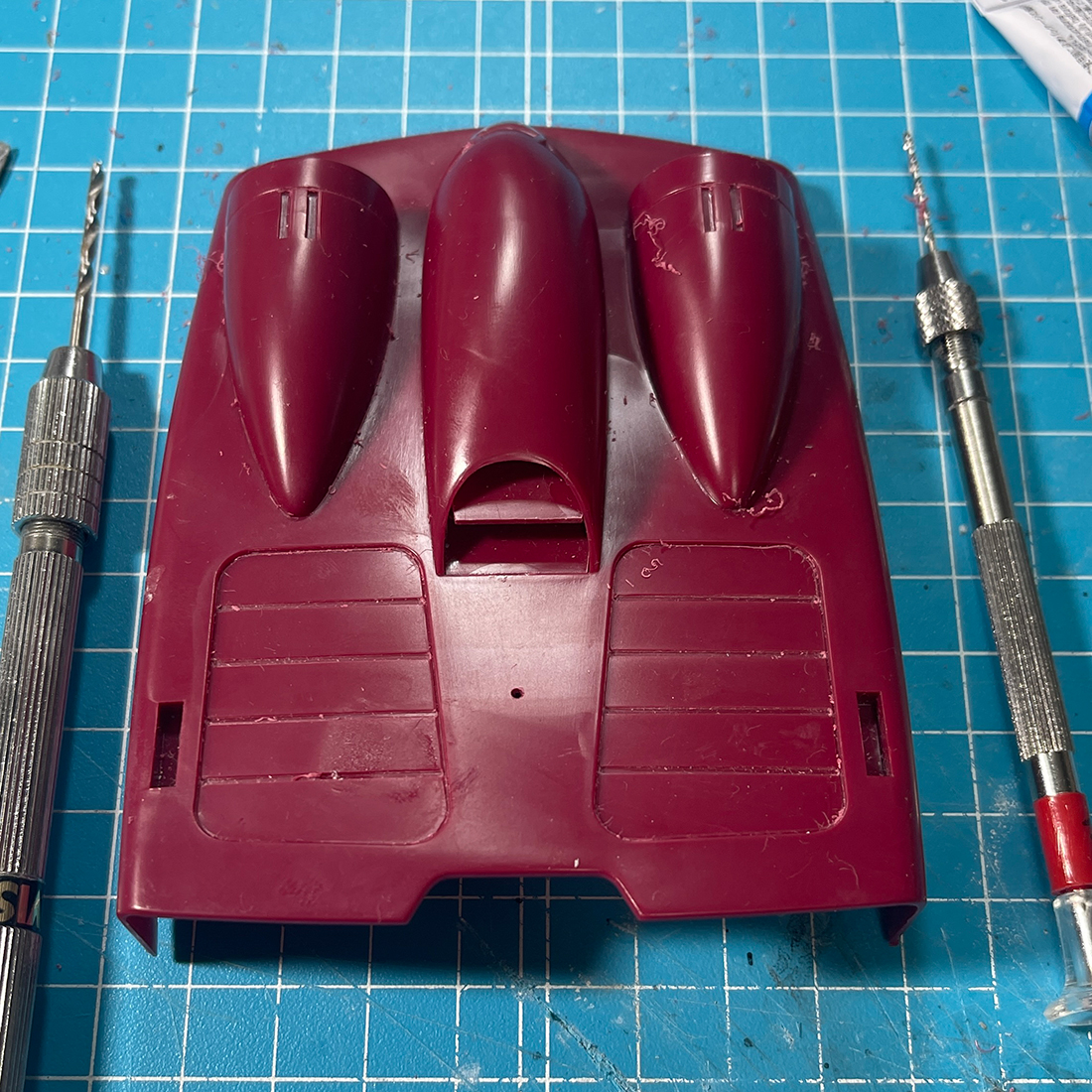 いうまでも無いですがいきなり3ミリドリルを打ち込むのではなくモデリングスクライバー → 1ミリドリル → 2ミリドリル → 3ミリドリルという順で穴を広げていきます。割れちゃいますからね。