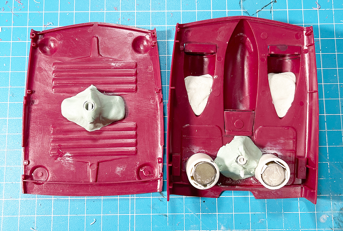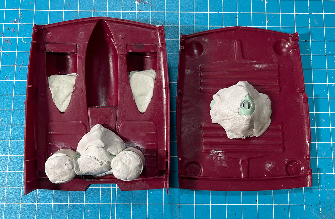 ダイソーエポパテは練ってから一分で硬化が始まるというウルトラ速乾パテなので細かく造形したい時には全く向きませんがこのように充填していきたいんだ、という用途では強力な味方となりますのでこの辺りはプラモ用エポパテと用途に応じて使い分けていけばいいのではないかと思いますね。