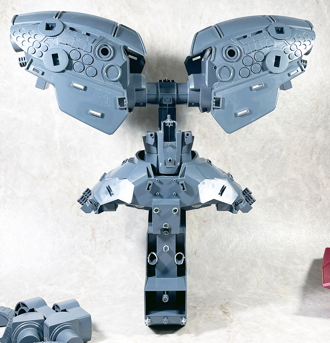 肩フレームはメカサフを通常サフがわりにさっと吹いてその上に明るめのグレーを吹きました。乾燥後該当箇所をマスクして再度メカサフを吹けば塗り分け出来るという算段です。