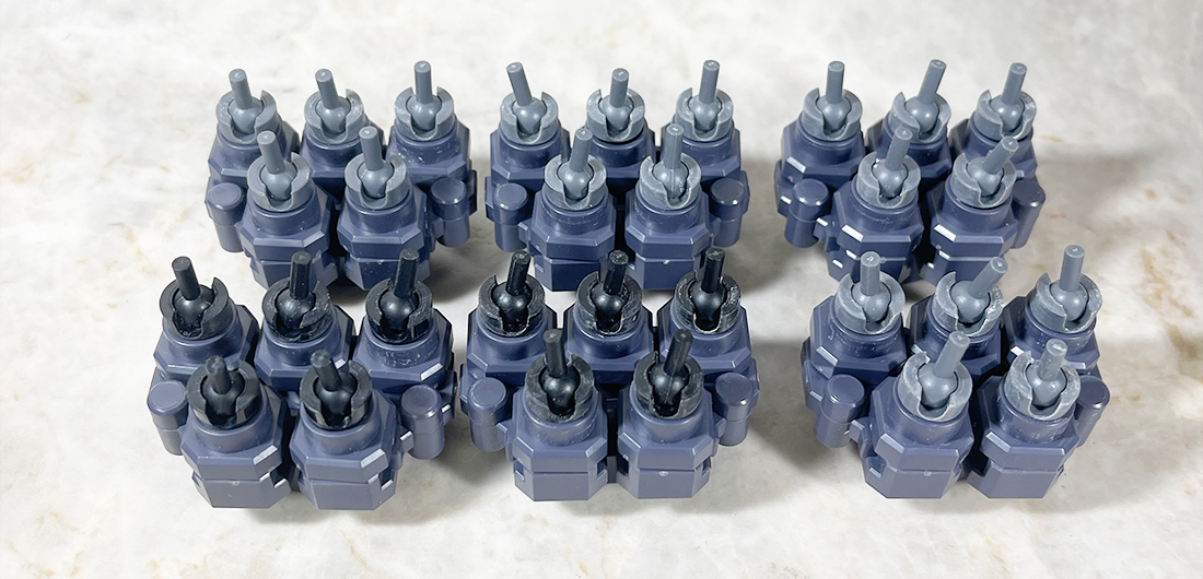 これがまたね、ほんと大変なんですよ。実際の軸は3ミリより太めに(おそらく保持力を確保するためにわざと)成型されておったため、受け側をドリルで嵌合調整しながら30本用意しなければならず、この工程だけで一時間前後かかってますね。まぁ今日の作業はほんと疲れましたわ。