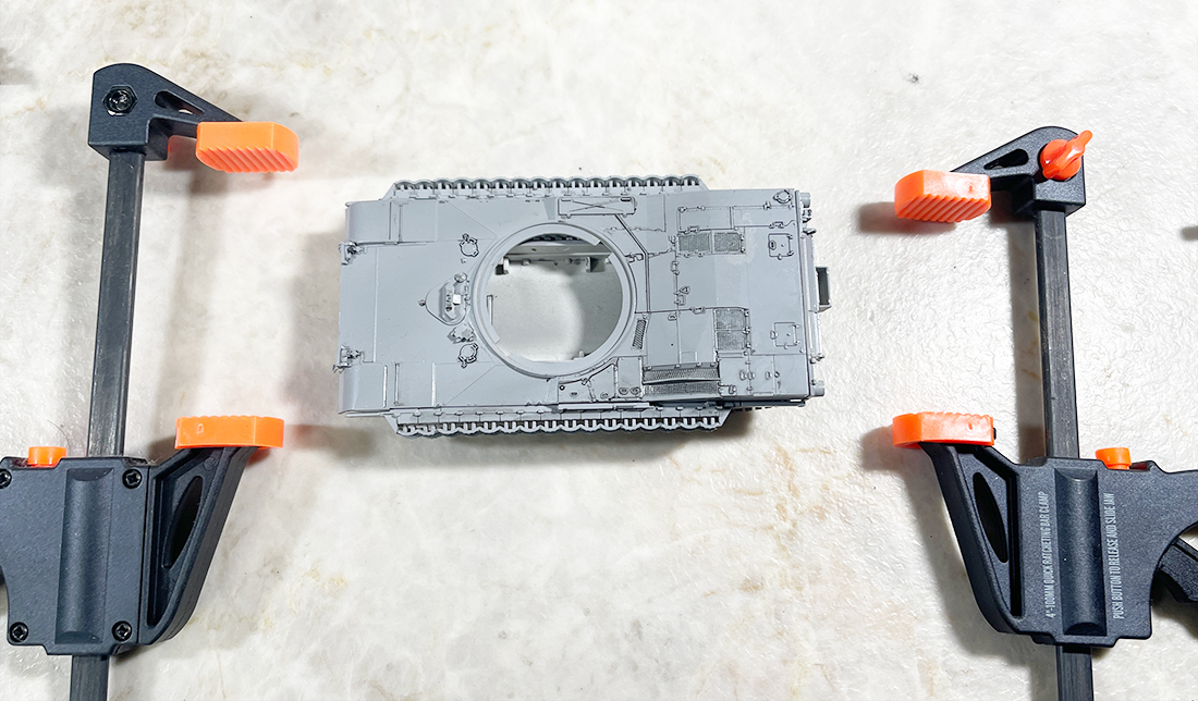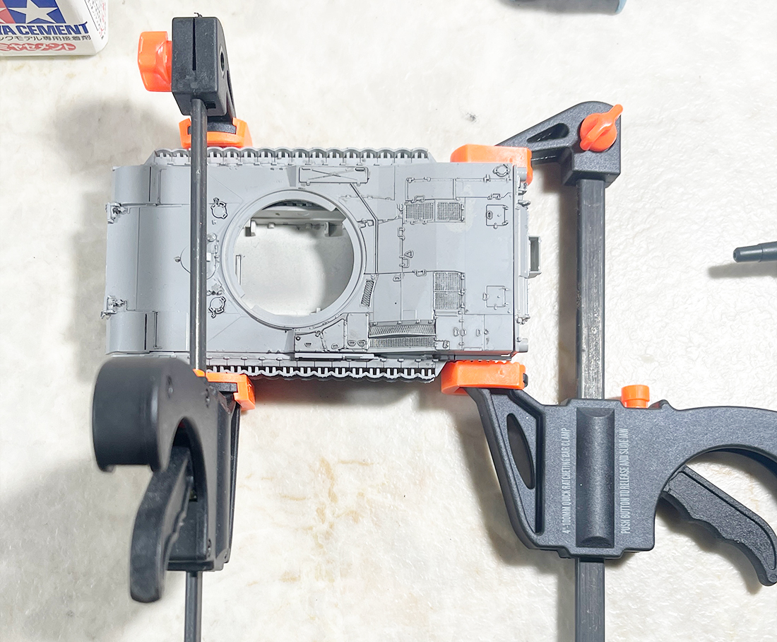 履帯の横にくっつくビラビラ?はクランプを使ってセメントがある程度固まるまで保持。
