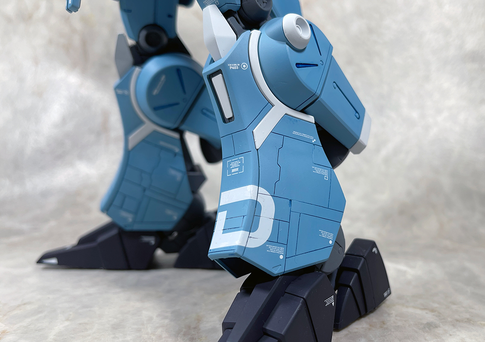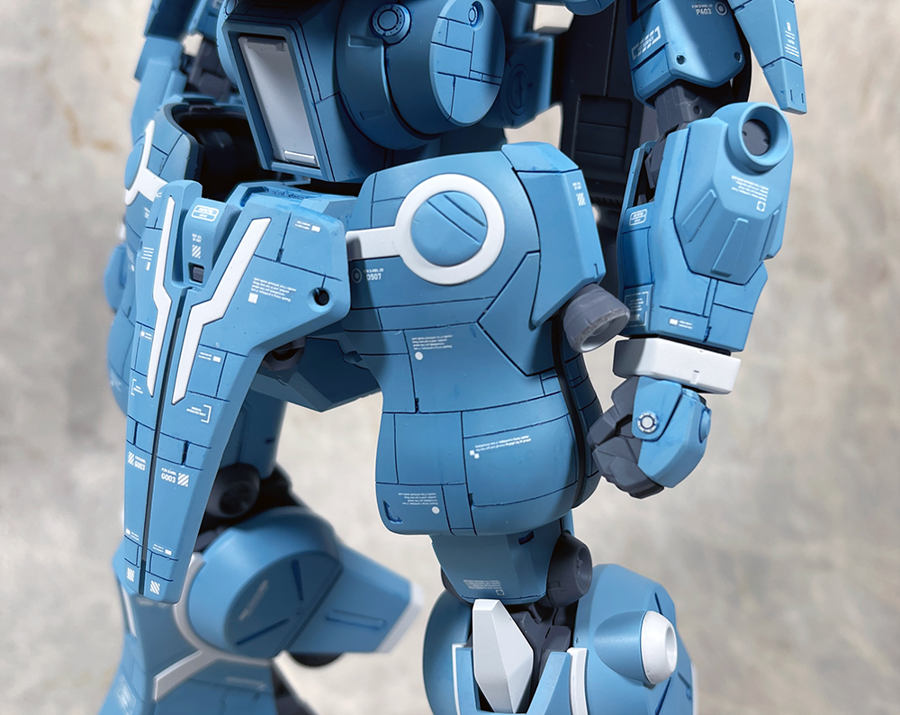 整形色のアンニュイなブルーに惚れ込んでさらに憂鬱な雰囲気の配色にしてみました。あと整形色で赤い部分と黄色い部分も好みで白系の塗料で塗りました。完成後見えなくなりますが球体上のコックピットは赤で塗装してます。