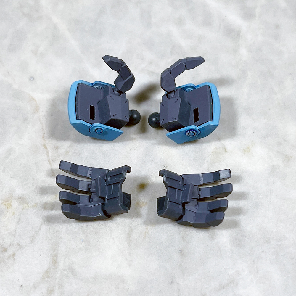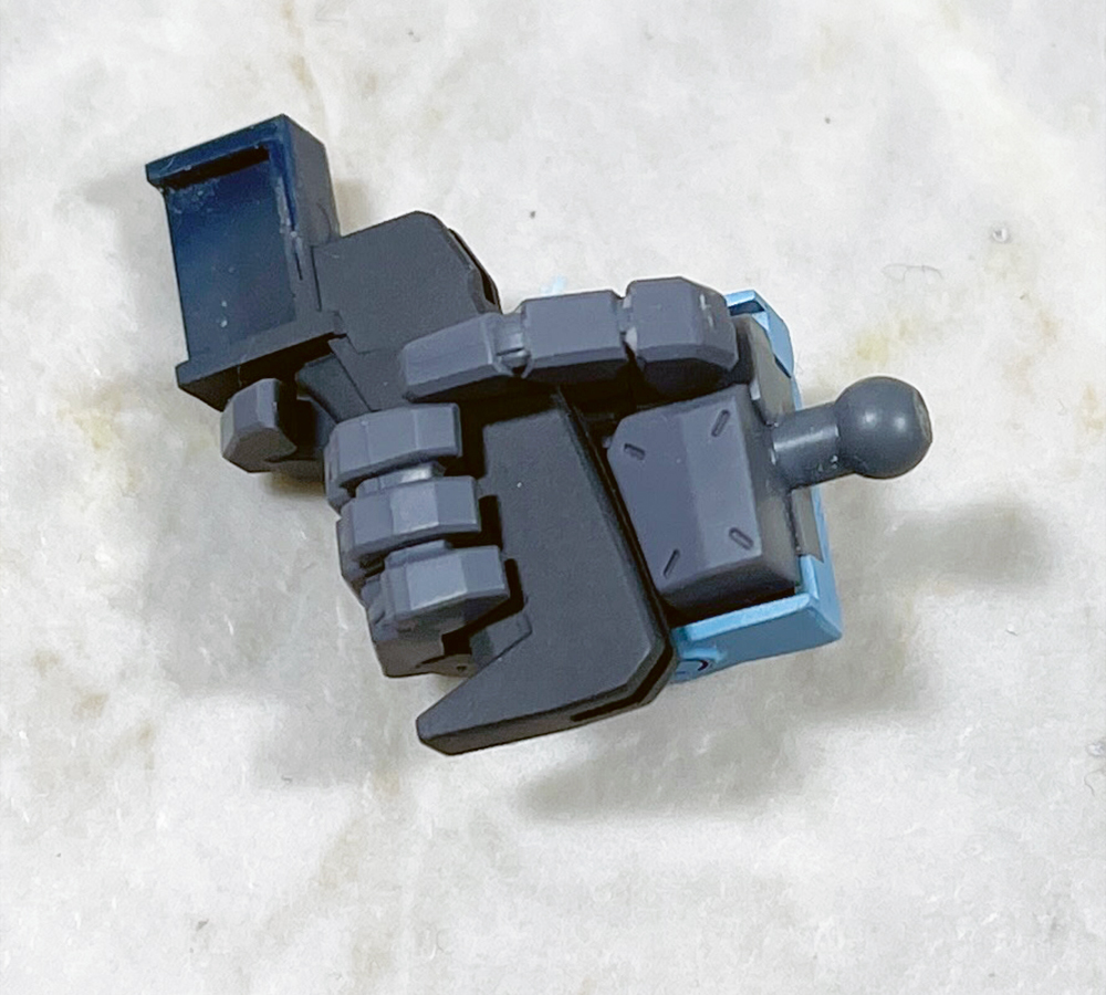 手首なんですけど、近年のMGですっかり定着した4本指部分を差し替えて武器を持たせたり平手にしたりを表現していきます。左右どちらもそうです。